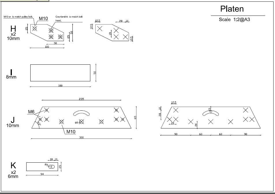 For the platen: 1x M12 Hexagon Head Setscrews bolt 72mm + 1x Washer, + 1x Hex Nut. 2x M10 Hexagon Head Setscrews 90mm + 2x Hex Nyloc Nuts, + 4x Hex Nuts, + 6x Washers, 2x Spring Washers. + 6x M6 Socket Head Countersunk Screws 25mm.